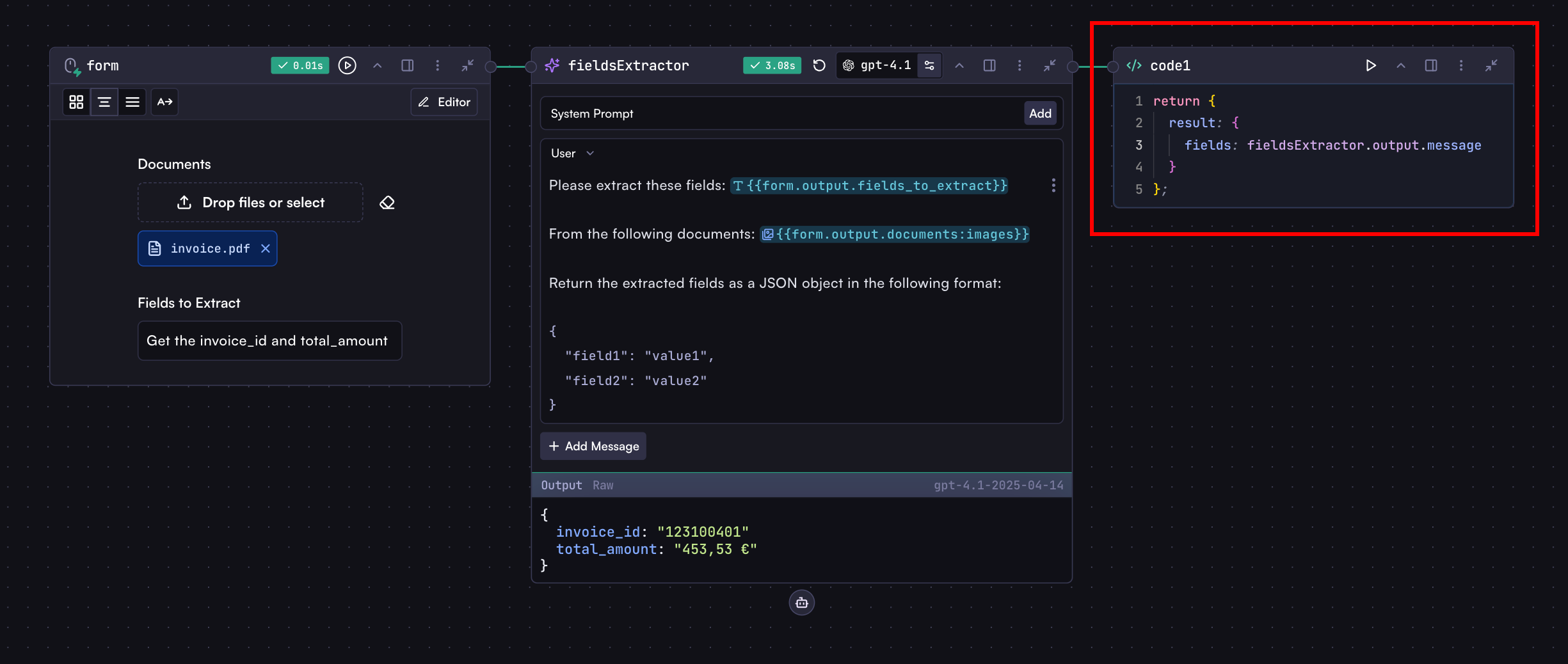 To make your workflow API-ready, you’ll need to add a code step that returns the extracted data: